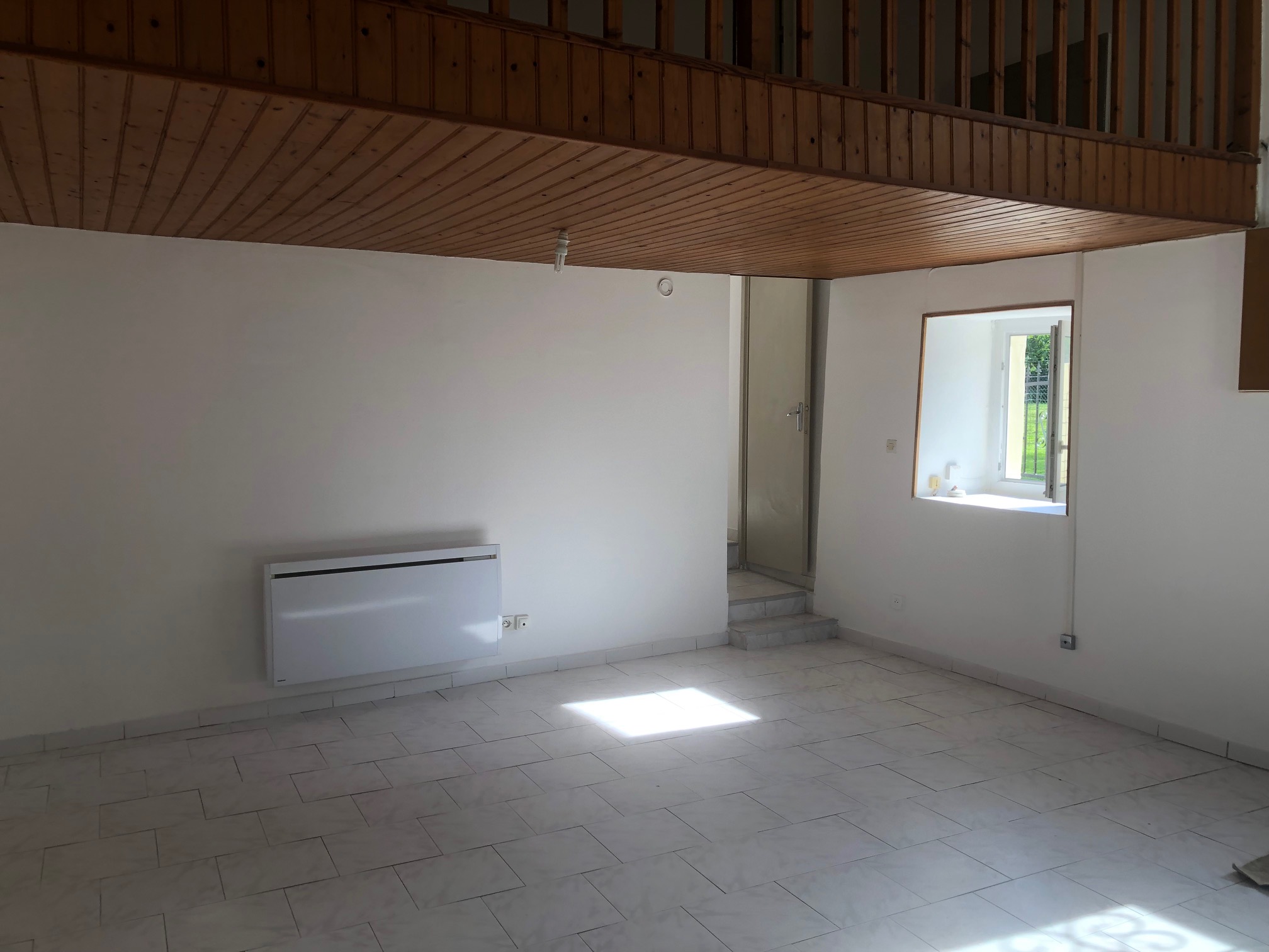 Une maison T2 avec cour et grand garage, un grand séjour avec poêle bois buche, une cuisine séparée, un WC, une salle d'eau, un palier, 1 chambre avec un un cabinet de toilettes, le tout au coeur d'un hameau sis commune de BOUGON